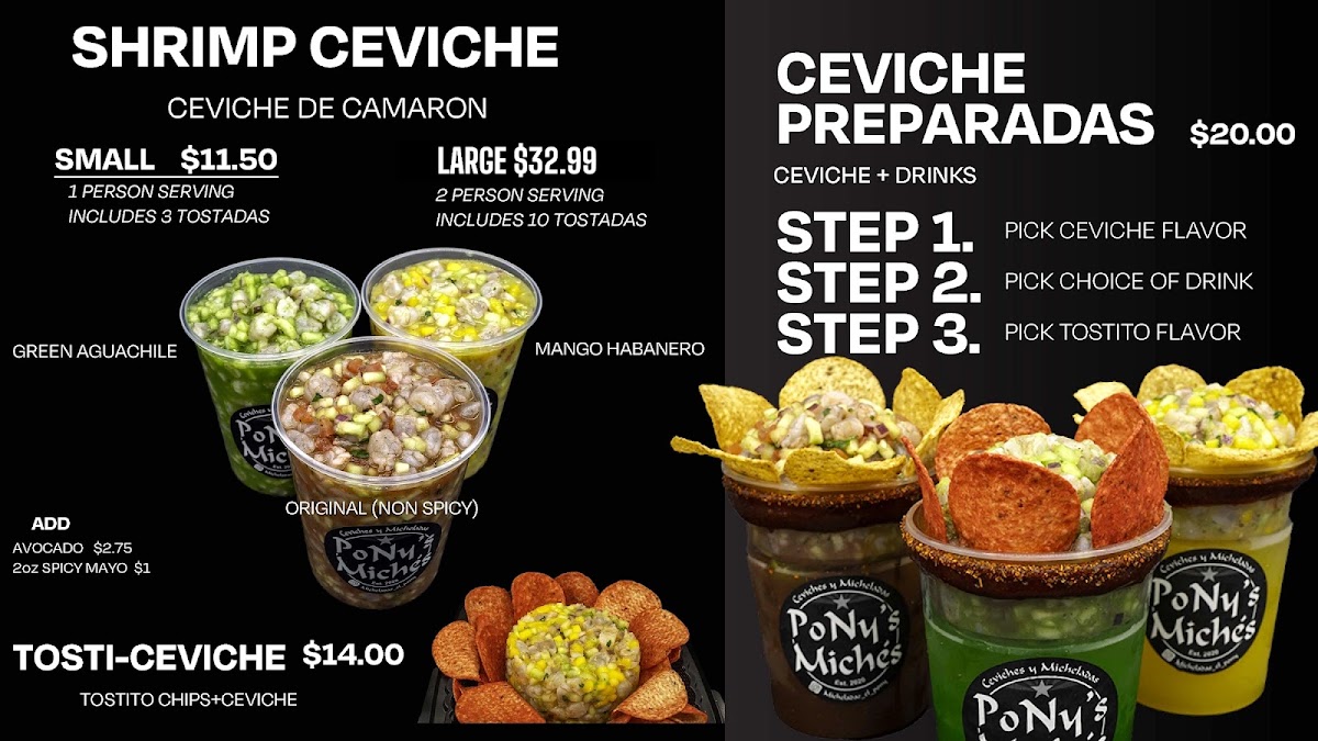 PoNy’s Miches, located at 725 Estrella Pkwy, Goodyear, AZ, is a fresh culinary gem specializing in vibrant, flavorful ceviches and seafood dishes. Their menu showcases an array of ceviche options, including the highly praised Mango Habanero Ceviche and classic ceviche preparations, each priced at $20. For those craving heartier fare, their Shrimp Burger is a must-try, served with fries at $15.